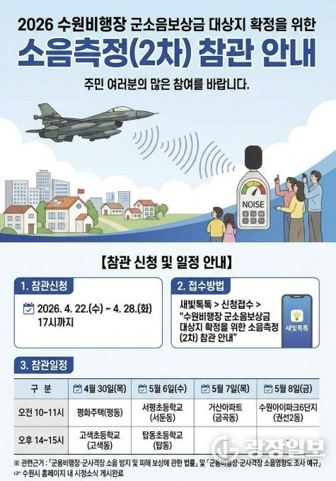 광장일보 주재영 기자 | 수원특례시가 수원비행장 인근 주민들의 소음 피해 보상 근거가 될 국방부의 ‘수원비행장 소음 영향도 조사 2차 소음측정’ 주민 참관 참여자를 모집한다. 4월 28일까지 새빛톡톡으로 신청할 수 있다.