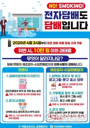 신유정 보건소장은 “담배사업법 개정을 통해 전자담배에 대한 관리 체계가 마련된 만큼 충분한 안내와 지속적인 점검을 병행하겠다”라며, “군민들이 혼선 없이 변화된 제도를 이해하고 준수하게 하여 쾌적한 하동군을 만드는 데 최선을 다하겠다”라고 말했다.
