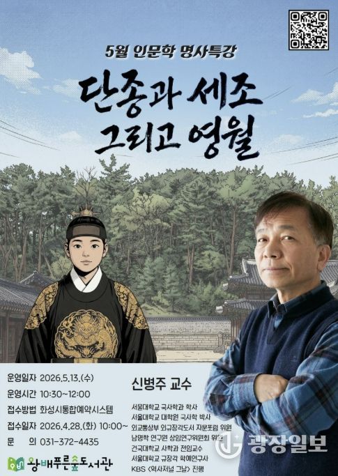 광장일보 나병석 기자 | 화성시문화관광재단 운영하는 왕배푸른숲도서관이 오는 5월 13일, 지역 주민들을 위해 역사학자 신병주 교수를 초청하여 5월 인문학 명사특강을 개최한다.