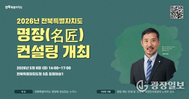 광장일보 주재영 기자 | 전북특별자치도는 5월 8일 전북도청 3층 중회의실에서 ‘2026년 전북특별자치도명장 컨설팅’을 개최한다고 23일 밝혔다.