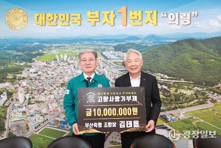광장일보 주재영 기자 | 의령군은 지난 21일 부산축협 김태용 조합장이 군을 방문해 고향사랑기부금 1,000만 원을 기탁했다고 밝혔다.