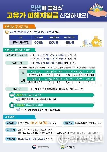 강상구 나주시장 권한대행은 “중동전쟁으로 인한 에너지 위기로 인해 어려움을 겪는 시민들이 이번 지원금을 통해 생활 안정에 도움이 되길 바란다”며 “기한 내 사용을 통해 지역경제 활성화에도 기여해 주시길 당부드린다”고 밝혔다.