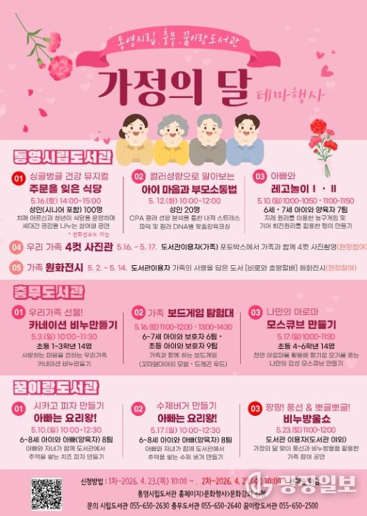 광장일보 주재영 기자 | 통영시립도서관은 5월 가정의 달을 맞아 ‘가족톡, 마음을 잇다’를 주제로 5월 한 달간 다양한 테마 문화행사를 운영한다고 23일 밝혔다.