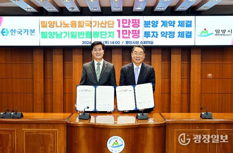 광장일보 주재영 기자 | 경남 밀양시는 23일 시청 소회의실에서 ㈜한국카본, 한국토지주택공사 경남지역본부와 함께 ‘밀양나노융합국가산업단지 부지분양 계약 및 밀양남기일반물류단지 투자약정’을 체결했다.