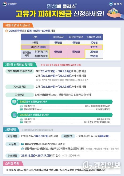 광장일보 주재영 기자 | 김해시는 정부의 고유가 피해지원금 지급 사업에 따라 오는 27일부터 7월 3일까지 1차, 2차로 나눠 전 시민의 70%를 대상으로 지급한다고 23일 밝혔다.