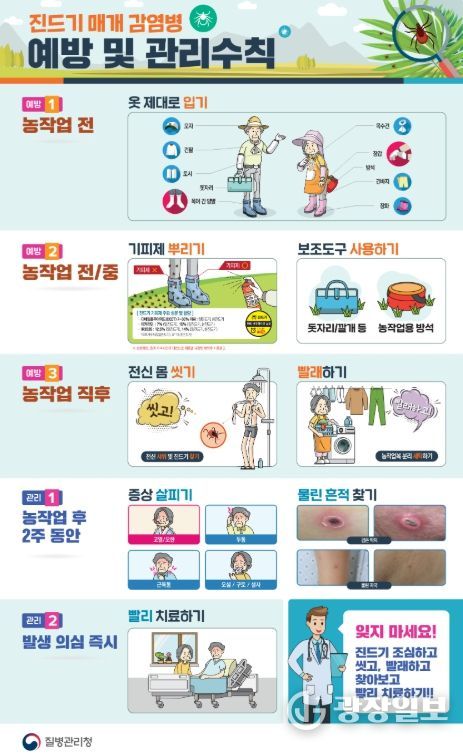 보건소 관계자는 “야외 활동이 늘어나는 봄철부터 예방 수칙을 철저히 준수하는 것이 무엇보다 중요하다”며 “야외 활동 후 2주 이내 발열, 근육통, 설사 등 진드기 매개 감염병 의심 증상이 나타날 경우 즉시 의료기관을 방문해 진료받길 바란다”고 전했다.
