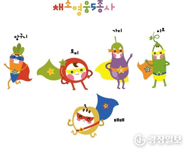 교육은 영양교육체험센터의 채소·과일 캐릭터인 슈퍼 히어로 채소과일 5총사 ▲토미(토마토) ▲가디(가지) ▲이오(오이) ▲당구니(당근) ▲배배(배) 가 인형을 변해 함께한다.