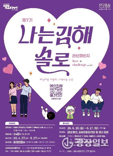 광장일보 주재영 기자 | 김해시는 오는 6월 20일부터 21일까지 1박 2일 일정으로 관내 펜션과 김해문화의전당 등에서 진행하는‘제7기 나는 김해솔로-러브챌린지’참가자 24명(남·여 각 12명)을 모집한다고 24일 밝혔다.