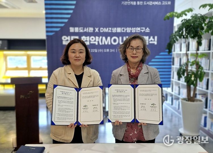 광장일보 주재영 기자 | 파주시 월롱도서관은 지난 22일 디엠지(DMZ)생물다양성연구소와 지역사회 독서진흥 및 생태환경 분야 협력을 위한 업무협약을 체결했다.