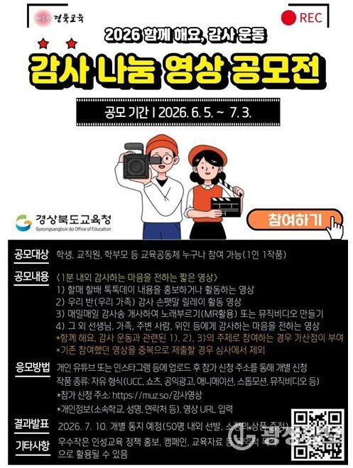 광장일보 주재영 기자 | 경북교육청은 학생과 학부모, 교직원 등 교육공동체가 함께 감사의 마음을 나누는 문화를 확산하기 위해 ‘감사 나눔 영상 공모전’을 개최한다고 24일 밝혔다.