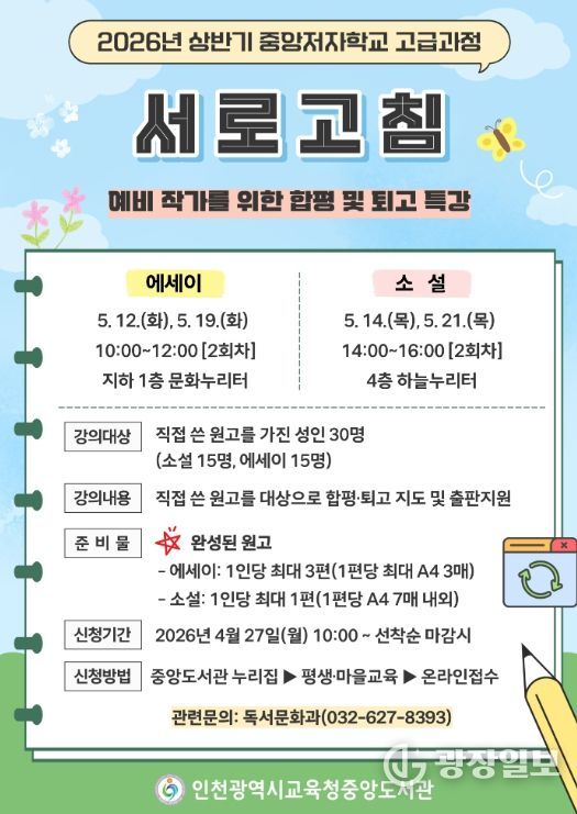 광장일보 주재영 기자 | 인천광역시교육청중앙도서관은 4월 27일부터 예비 작가를 위한 ‘중앙저자학교 고급과정’ 참여자를 모집한다.