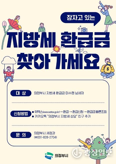 광장일보 주재영 기자 | 의정부시는 납세자가 아직 찾아가지 않은 지방세 환급금을 돌려주기 위해 5월 말까지 ‘지방세 환급금 일제정리 기간’을 운영한다.