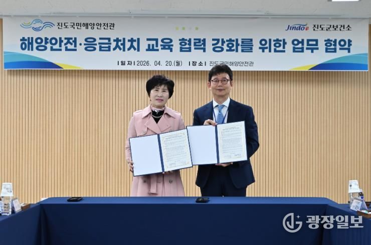 광장일보 주재영 기자 | 진도군보건소와 진도국민해양안전관은 지역의 응급의료 대응 역량을 강화하고 군민의 생명 보호 체계를 한층 높이기 위해 ‘해양안전 및 응급처치 교육’ 협력 강화를 위한 업무협약(MOU)을 체결했다.