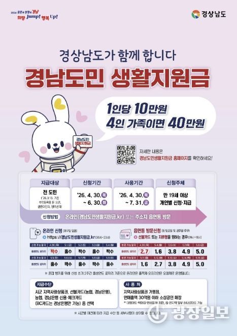 경남도민 생활지원금은 전 군민(2026년 3월 18일 주민등록 기준)을 대상으로 4월 30일부터 6월 30일까지 지급된다. 지원금액은 1인당 10만 원이며, 지급수단은 창녕사랑상품권, 신용·체크카드(농협-경남은행), 선불카드 등이다.