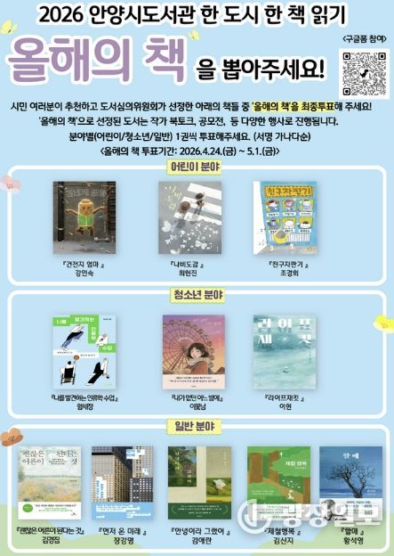 광장일보 주재영 기자 | 안양시는 2026년 한 도시 한 책 읽기 ‘올해의 책’ 선정을 위한 시민 선호도 조사를 오는 5월 1일까지 온·오프라인으로 진행한다고 24일 밝혔다.