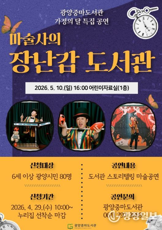 광장일보 주재영 기자 | 광양중마도서관은 가정의 달을 맞아 오는 5월 10일 오후 4시 어린이실에서 특집 공연 ‘마술사의 장난감 도서관’을 연다고 밝혔다.