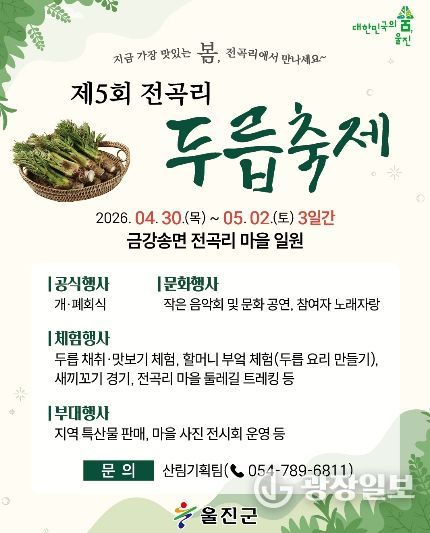 울진군 관계자는 “제철 두릅의 맛과 함께 다양한 체험을 즐길 수 있는 이번 축제에 많은 관심과 방문을 바란다”며 “지역 농산물 소비 촉진과 관광 활성화에도 기여할 것으로 기대한다”고 밝혔다.