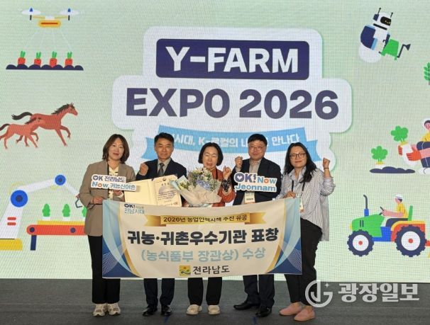 광장일보 주재영 기자 | 전라남도는 24일 수원컨벤션센터에서 열린 ‘2026 와이팜 엑스포(Y-FARM EXPO)’에서 농림축산식품부의 농업인력육성시책 추진 유공자 표창에서 귀농어귀촌 우수시책 추진기관으로 선정돼 장관상을 받았다.