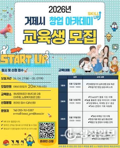 광장일보 주재영 기자 | 거제시는 지역 내 예비 창업자와 일반 시민이 일상 속 아이디어를 창업 으로 구현해볼 수 있도록 돕는'2026년 거제시 창업 아카데미' 교육생을 오는 4월 27일부터 모집한다.