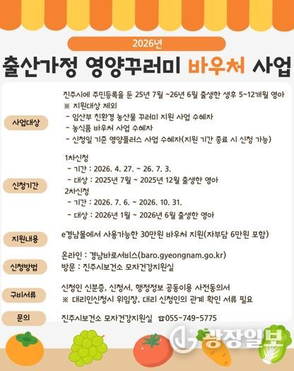 광장일보 주재영 기자 | 진주시보건소는 출산 가정의 경제적 부담을 덜고 영아의 건강한 성장과 발달을 지원하기 위해 2026년 신규사업인 ‘출산가정 영양꾸러미 바우처(Voucher) 지원사업’을 오는 27일부터 시행한다고 밝혔다.