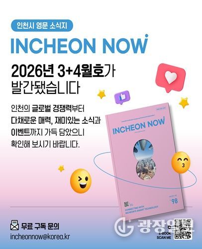 광장일보 주재영 기자 | 인천광역시는 도시의 혁신적인 정책과 차별화된 매력을 전 세계에 소개하는 영문소식지 '인천나우(Incheon Now)' 3·4월호(Vol. 98)를 발간했다고 밝혔다.
