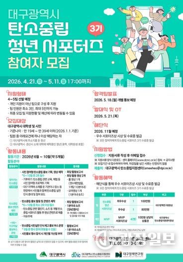 광장일보 주재영 기자 | 대구광역시는 기후위기 대응과 탄소중립 실천문화 확산을 위해 ‘대구시 탄소중립 청년 서포터즈 3기’ 참여자를 5월 11일까지 모집한다.