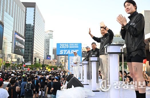 광장일보 주리아 기자 | 오세훈 서울시장은 26일 오전 광화문광장에서 열린 ‘2026 서울하프마라톤대회' 출발식에서 참가자들을 응원하고 안전한 완주를 당부했다.