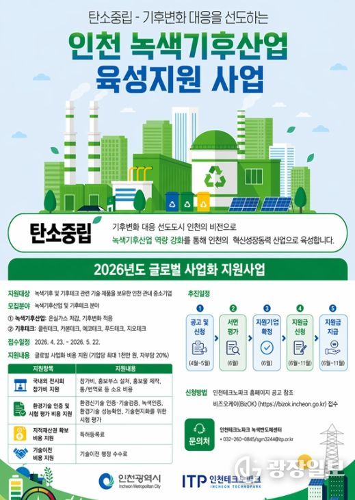 광장일보 주재영 기자 | 인천테크노파크(인천TP)는 중소기업의 녹색기후·기후테크 분야 글로벌 진출을 지원하고자 ‘2026년 녹색기후산업 글로벌 사업화 지원사업’의 참여기업을 5월 22일까지 모집한다.
