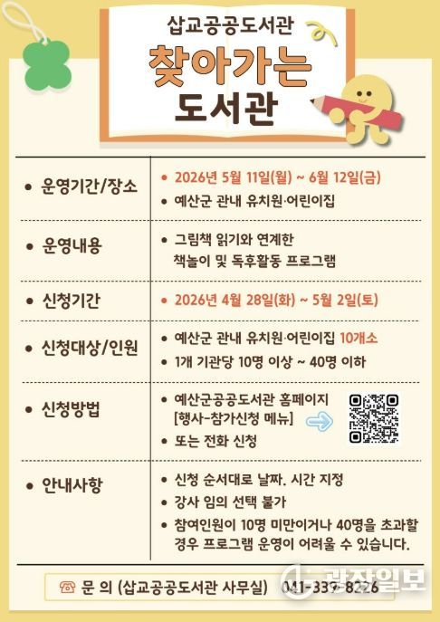광장일보 나학천 기자 | 예산군 삽교공공도서관은 5월 11일부터 6월 12일까지 관내 유치원·어린이집을 대상으로 ‘찾아가는 도서관’ 프로그램을 운영한다.