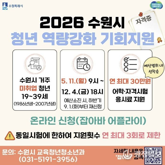 광장일보 주재영 기자 | 수원특례시는 미취업 청년의 취업 준비 비용 부담을 덜어주는 ‘청년 역량강화 기회 지원 사업’을 12월 4일까지 운영한다. 미취업 청년에게 어학·자격시험 응시료를 1인당 연 최대 30만 원 지원한다.