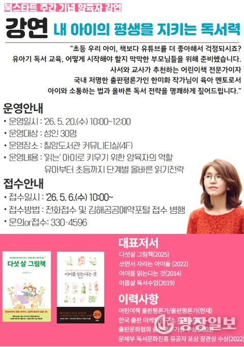 광장일보 주재영 기자 | 김해시 칠암도서관은 북스타트 주간을 맞아 올바른 독서 양육의 방향을 제시하기 위해 내달 20일 ‘내 아이의 평생을 지키는 독서력’ 강연을 개최한다고 27일 밝혔다.
