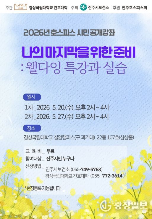 광장일보 주재영 기자 | 진주시와 경상국립대 간호대학은 ‘나의 마지막을 위한 준비’를 주제로 오는 5월 20일과 5월 27일 경상국립대 칠암캠퍼스(옛. 경남과학기술대) 22동 107호(삼삼홀)에서 ‘호스피스 시민 공개강좌’를 실시한다.