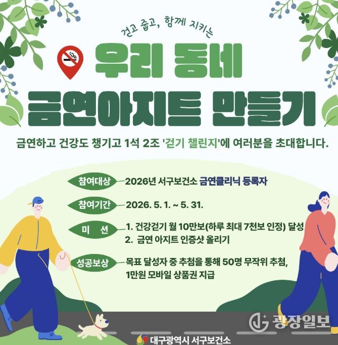 광장일보 주재영 기자 | 대구 서구보건소는 금연 시도자들이 일상에서 즐겁게 목표를 달성할 수 있도록 금연 실천과 신체 활동을 결합한 ‘우리 동네 금연 아지트 만들기’ 챌린지를 오는 5월부터 10월까지 본격 운영한다고 밝혔다.