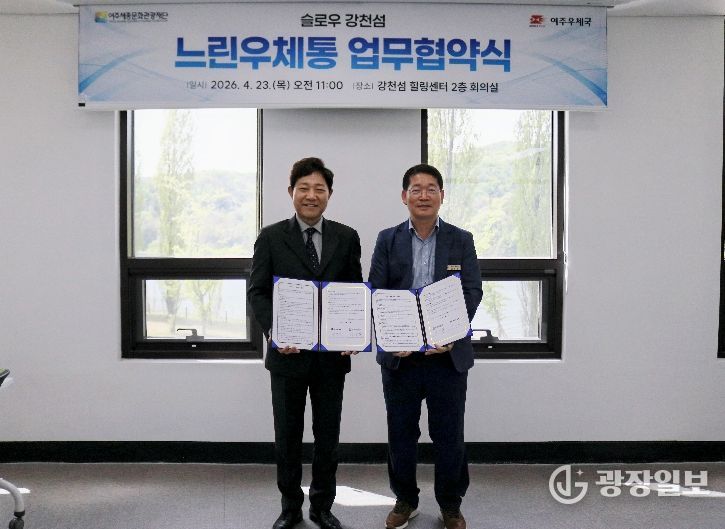 광장일보 주재영 기자 | 여주세종문화관광재단과 여주우체국은 4월 23일 강천섬 힐링센터에서 ‘슬로우 강천섬 느린우체통 업무협약(MOU)’을 체결했다. 빠르게 흘러가는 일상 속에서 잠시 걸음을 멈추고, 소중한 사람에게 미래의 마음을 전할 수 있는 감성 관광콘텐츠를 공동으로 운영하기 위해서다.