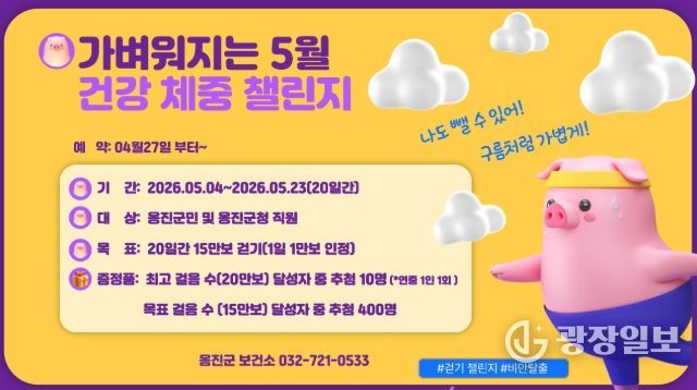 광장일보 주재영 기자 | 옹진군은 군민의 일상 속 걷기 실천을 유도하고 비만 예방 및 건강체중 관리를 지원하기 위해 5월 4일부터 23일까지 20일간 '가벼워지는 5월, 건강체중'챌린지 참가자를 4월 27일부터 모집한다고 밝혔다.