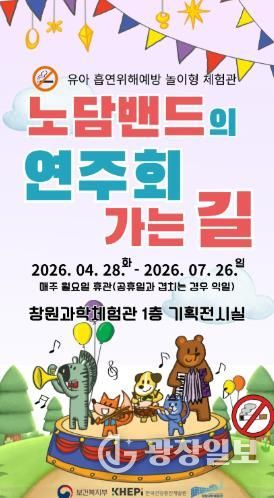 광장일보 주재영 기자 | 창원특례시 창원과학체험관은 오는 4월 28일부터 7월 26일까지 1층 기획전시실에서 유아 대상 흡연 예방 놀이형 특별전시 ‘노담밴드의 연주회 가는 길’을 개최한다.