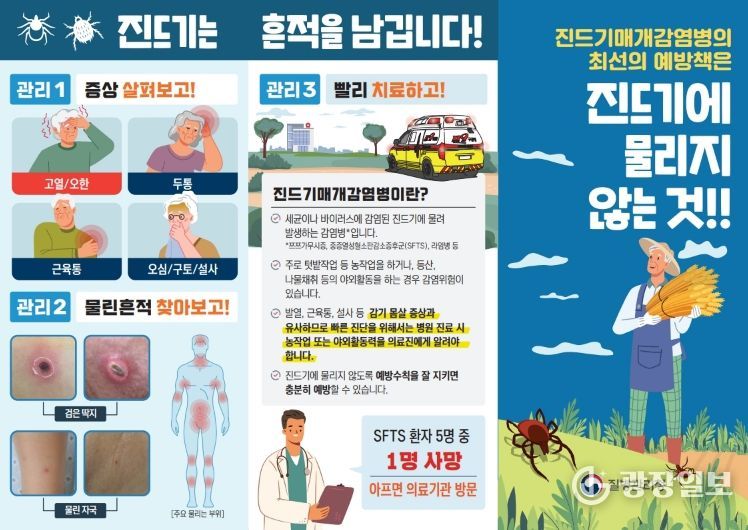 광장일보 주재영 기자 | 질병관리청은 진드기 매개 감염병인 중증열성혈소판감소증(SFTS) 환자가 4월 23일(목) 울산광역시에서 올해 처음 발생했다고 밝혔다. 첫 환자는 농작업을 하던 70대 남성으로, 현재 입원 치료 중이다. 특히, 경상북도는 2025년 SFTS 환자 수 45명으로 전국 1위를 기록하여 김천시 주민들의 각별한 주의가 요구된다.