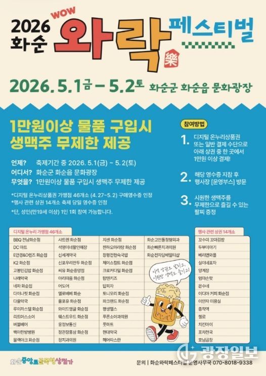 광장일보 주재영 기자 | 화순군은 오는 5월 1일부터 2일까지 이틀간 화순읍 광덕문화광장 일원에서 ‘2026 화순 와락 페스티벌’을 개최한다고 밝혔다.