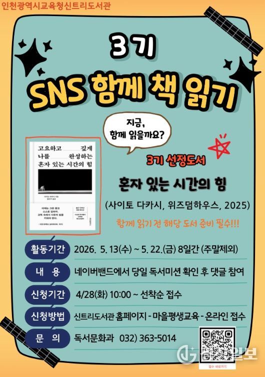광장일보 주재영 기자 | 인천광역시교육청신트리도서관은 시민의 일상 속 독서 참여를 확대하고 온라인 기반 독서 문화를 활성화하기 위해, 4월 28일부터 ‘SNS 함께 책 읽기’ 3기 참여자를 모집한다.