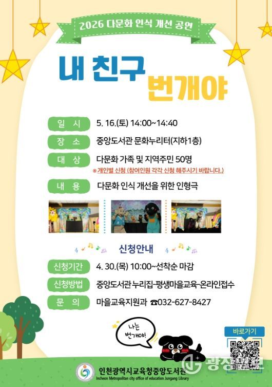 광장일보 주재영 기자 | 인천광역시교육청중앙도서관은 오는 5월 16일 다문화 인식 개선 공연 ‘내 친구 번개야’를 운영한다.
