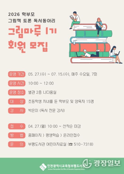 광장일보 주재영 기자 | 인천광역시교육청부평도서관은 학부모의 독서 역량을 강화하고 자녀와의 소통을 돕기 위해 2026년 상반기 학부모 독서동아리 ‘그림마루 1기’ 참여자를 모집한다.