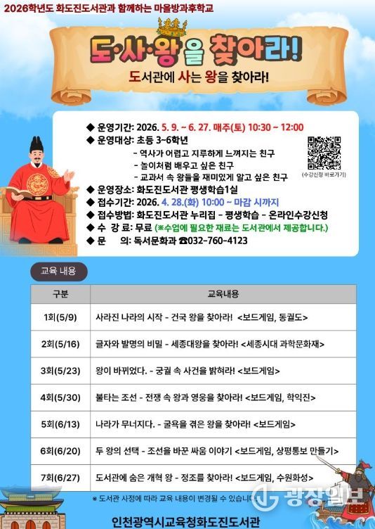광장일보 주재영 기자 | 인천광역시교육청화도진도서관은 5월 9일부터 6월 27일까지 매주 토요일, 초등 3~6학년을 대상으로 역사 프로그램‘도서관에서 사는 왕을 찾아라!’를 운영한다.