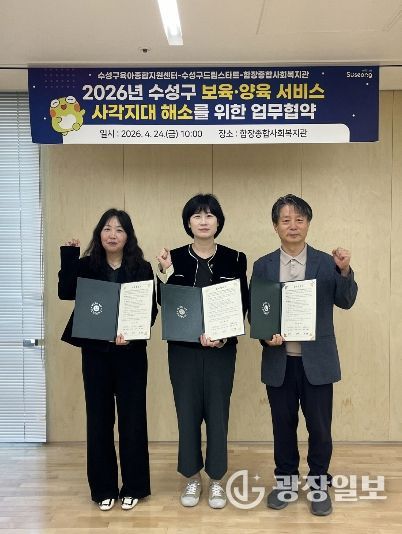 광장일보 주재영 기자 | 대구 수성구육아종합지원센터(센터장 심영숙)는 지난 24일 수성구 드림스타트센터(센터장 김은미), 함장종합사회복지관(관장 권혁철)과 지역 내 보육·양육 서비스 사각지대 해소를 위한 ‘3자 업무협약(MOU)’을 체결했다고 밝혔다.