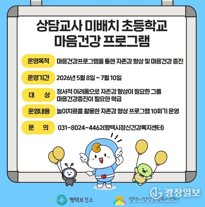 광장일보 주재영 기자 | 평택시는 상담교사가 배치되지 않은 초등학교 학생들의 정신건강 지원을 위해 ‘마음건강 프로그램’을 운영한다고 밝혔다.