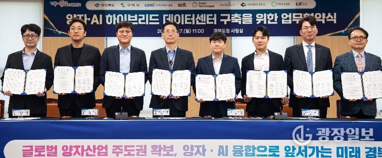 경상북도는 4월 27일 경북도청 회의실에서 황명석 경상북도지사 권한대행, 정성현 구미시장 권한대행을 비롯해 윤지원 ㈜SDT 대표, 신동주 ㈜모빌린트 대표, 문추연 구미전자정보기술원 원장, ㈜I-ESG 김종웅 대표, LS증권(주) 배건 복합금융본부장, ㈜마키나락스 심상우 CTO가 참석한 가운데‘양자·AI 하이브리드 데이터센터 구축을 위한 업무협약(MOU)’을 체결했다.