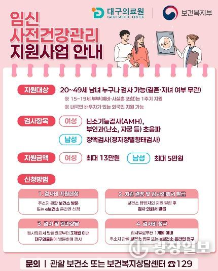광장일보 주재영 기자 | 대구의료원 난임센터는 임신·출산에 장애가 될 수 있는 건강 위험요인을 조기에 발견하기 위한 ‘임신 사전건강관리 지원사업’ 참여의료기관으로 선정돼, 지역 주민의 건강한 임신·출산 환경 조성을 적극 지원한다.