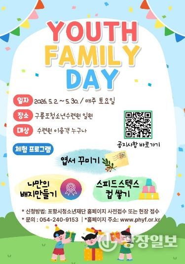 광장일보 주재영 기자 | 포항시청소년재단 구룡포청소년수련원은 5월 가정의 달을 맞아 청소년과 가족이 함께 참여하는 체험형 프로그램 ‘2026년 5월 YOUTH FAMILY DAY’를 운영한다.