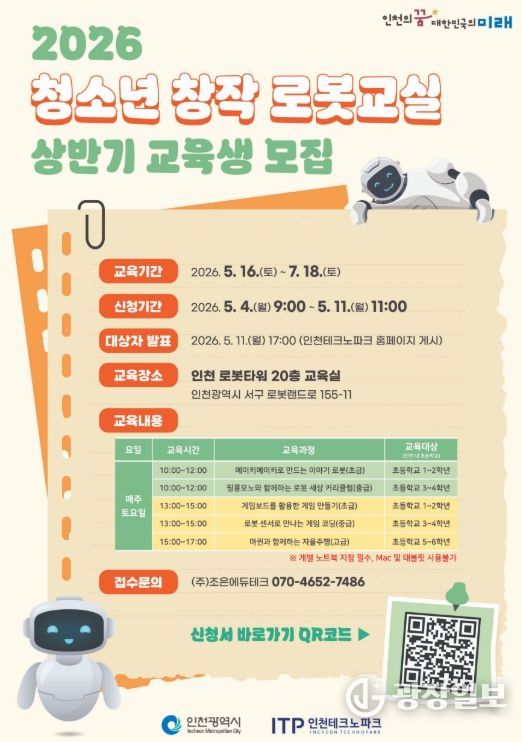 광장일보 주재영 기자 | 인천테크노파크(인천TP)는 인천 관내 초등학생을 대상으로 로봇과 인공지능(AI)기술을 직접 체험하는 ‘2026년 청소년 창작 로봇교실’ 상반기 교육생을 5월 11일까지 모집한다고 밝혔다.