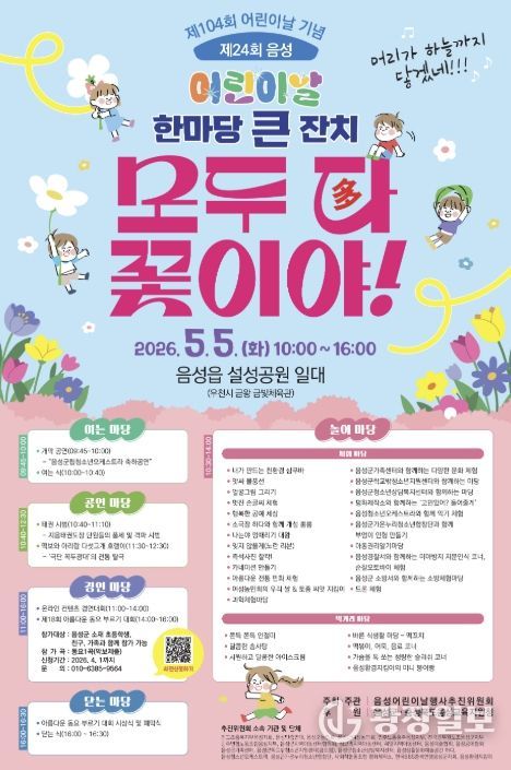 이번 행사는 음성어린이날행사추진위원회가 주최·주관하며, ‘모두 다(多) 꽃이야!’를 주제로 어린이들이 마음껏 꿈을 펼치고 가족과 함께 즐거운 추억을 만들 수 있도록 다채로운 프로그램으로 운영될 예정이다.