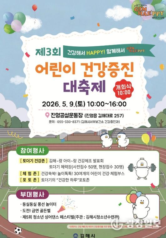 광장일보 주재영 기자 | 김해시서부보건소는 오는 5월 9일 진영공설운동장에서 관내 영유아와 초등학생, 가족 등 2,000여 명을 대상으로 ‘제3회 어린이 건강증진대축제’를 개최한다고 밝혔다.